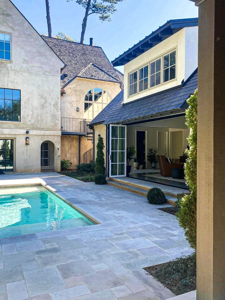 This vibrant retreat was designed for a young family seeking a playful escape just steps from their main house. We began by creating a CAD-based 3D rendering to maximize functionality and flow. The husband envisioned leather swivel chairs to anchor the lounge, as the main room doubles as a wine room. We sourced a rich vegan leather—durable enough to handle wet swimsuits and the occasional wine spill. The pool house functions as both a guest cottage and a weekend hangout, complete with a full bath, kitchenette, and cozy seating area. Outside, the pool and dining terrace extend the lively palette, offering a seamless setting for year-round entertaining.